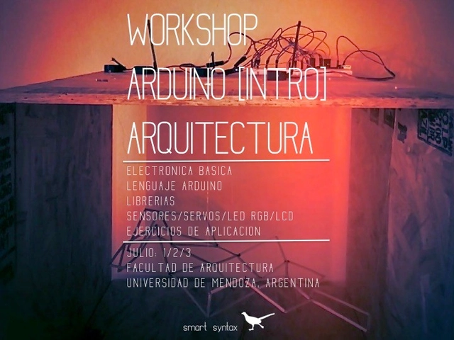Smart Syntax consiste en un conjunto de workshops, que buscan relacionar Arquitectura, Urbanismo y Diseño con plataformas o programas Open Source [Processing, Arduino, vvvv, Open Frameworks, Rhinoceros, Grasshopper] y nuevas tecnologías.