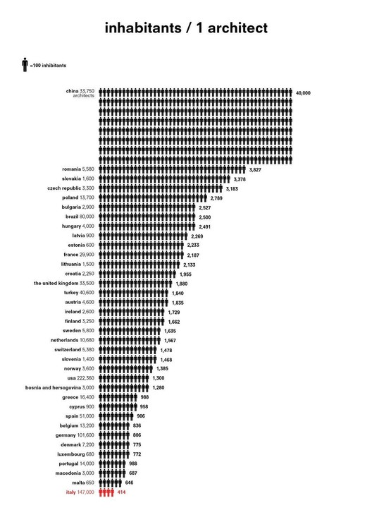 Monditalia - una de las tres secciones que actualmente están siendo preparadas para la Bienal de Arquitectura de Venecia 2014- tuiteó una infografía mostrando el índice de arquitectos por cada mil habitantes en 36 países alrededor del mundo. La infografía muestra que Italia tiene un estremecedor porcentaje de arquitectos en su población: por cada 414 italianos, uno es arquitecto. Según el trabajo de Monditalia, Dinamarca, Alemania, Bélgica, Portugal, España y Grecia -estos últimos tres países en crisis- tienen índices inferiores a un arquitecto por cada 1.000 habitantes. Por supuesto, hay otros países sobrecargados que no aparecen en la lista: uno no mencionado es Chile, un país que -según su último Censo- tiene un arquitecto por cada 667 habitantes, tal como México, con 724 habitantes por cada arquitecto. En el otro extremo, China solamente cuenta con un arquitecto para 40.000 personas. Obviamente, como Monditalia únicamente ha lanzado un pequeño adelanto de esta infografía vía twitpic (más información será compartida cuando la Bienal parta a comienzos de Junio), tenemos algunas preguntas sobre la información (¿de dónde vienen los datos?, ¿son exactas?). No obstante, la infografía sí arroja interesantes líneas de cuestionamiento. En este momento de la recesión que estruja a Europa y complica a EE.UU., hemos abordado el tema de los mercados sobresaturados de arquitectos, como también la gran migración de colegas alrededor del mundo. Ya hemos pedido a nuestros lectores que compartan información sobre cuáles son los mejores países para encontrar trabajo (respuestas compiladas en una lista que puedes encontrar en inglés acá). Sin embargo, el gráfico es la excusa para una pregunta ligeramente distinta: ¿existe un ‘índice dorado’ de arquitectos/habitantes? Y, si es así, ¿cuál es? ¿1:3.000 como en República Checa?, ¿1:4.000 como en China?, ¿cuántos arquitectos son suficientes? Por otra parte, ¿el índice fluctuaría si la economía crece o se contrae? ¿Deberíamos intentar controlar el número de estudiantes de arquitectura para alcanzar ese ‘índice dorado’? Nos encantaría oír lo que piensas sobre el número de arquitectos en tu país en los comentarios a continuación.